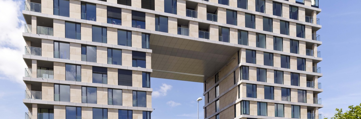 The high-value Kavci Hory residential complex in the south of Prague consists of two parts, a 12 story tower, with a conspicuous opening, and a smaller 6-story building next to it. All of the 88 luxury apartments in the complex are generously illuminated. Built using natural stone, glass, and high quality woods, they have large loggias and terraces. The stone façade was supplemented by Schüco ADS 75.SI and AWS 75.SI aluminium systems and generously glazed to afford a view of Vltava river and the old part of Prague.